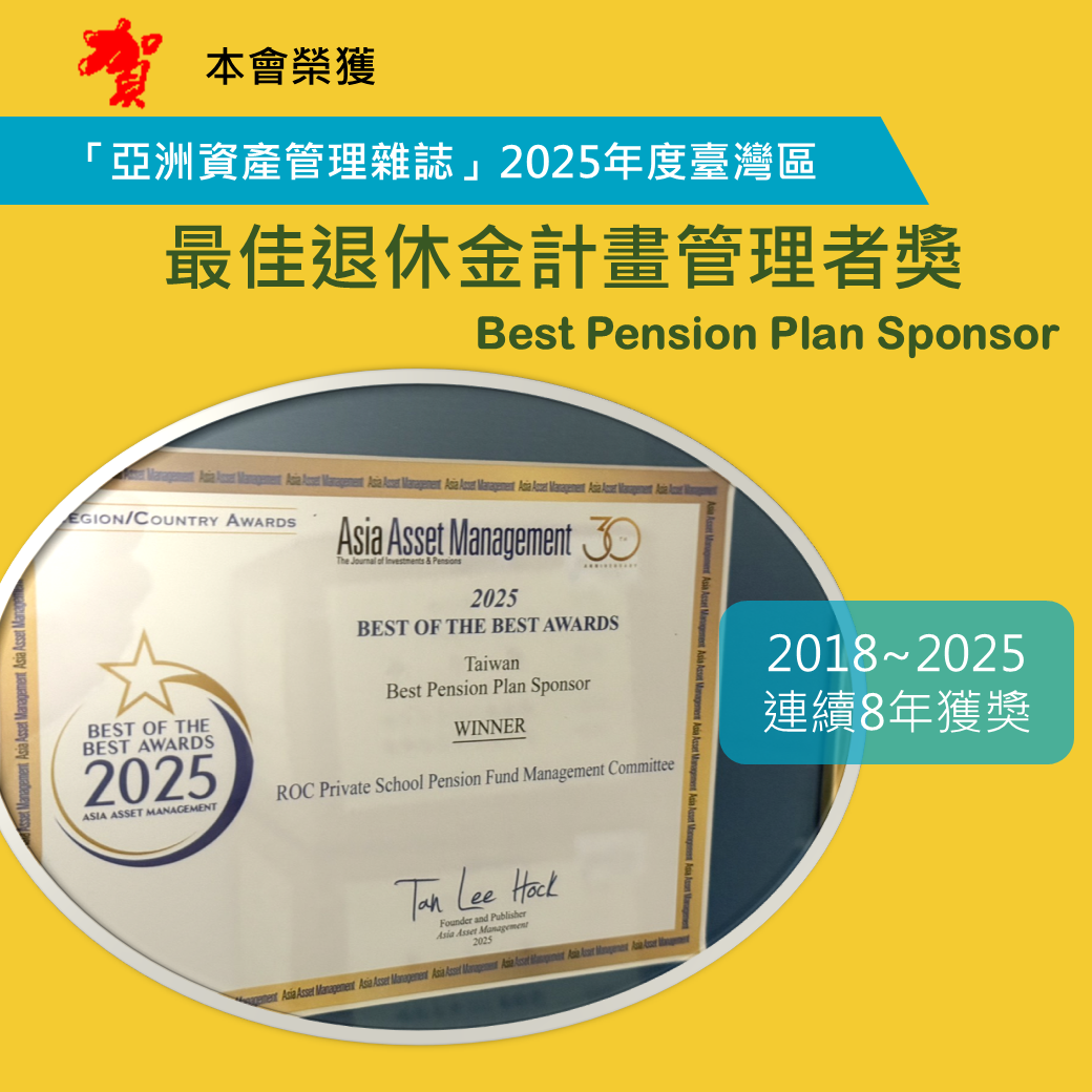 賀!私校退撫儲金管理會連續八年榮獲亞洲資產管理雜誌「台灣區最佳退休金計畫管理者獎」