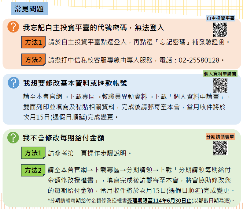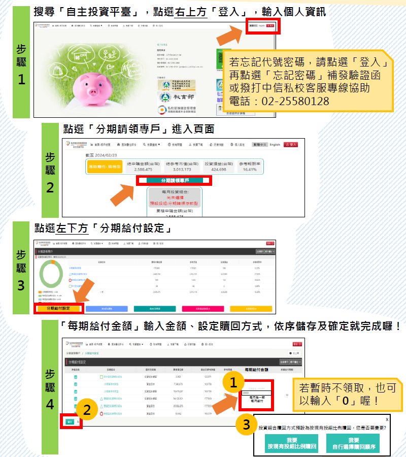 每月1-15日可至自主投資平臺設定每期給付金額,請儘早完成變更。